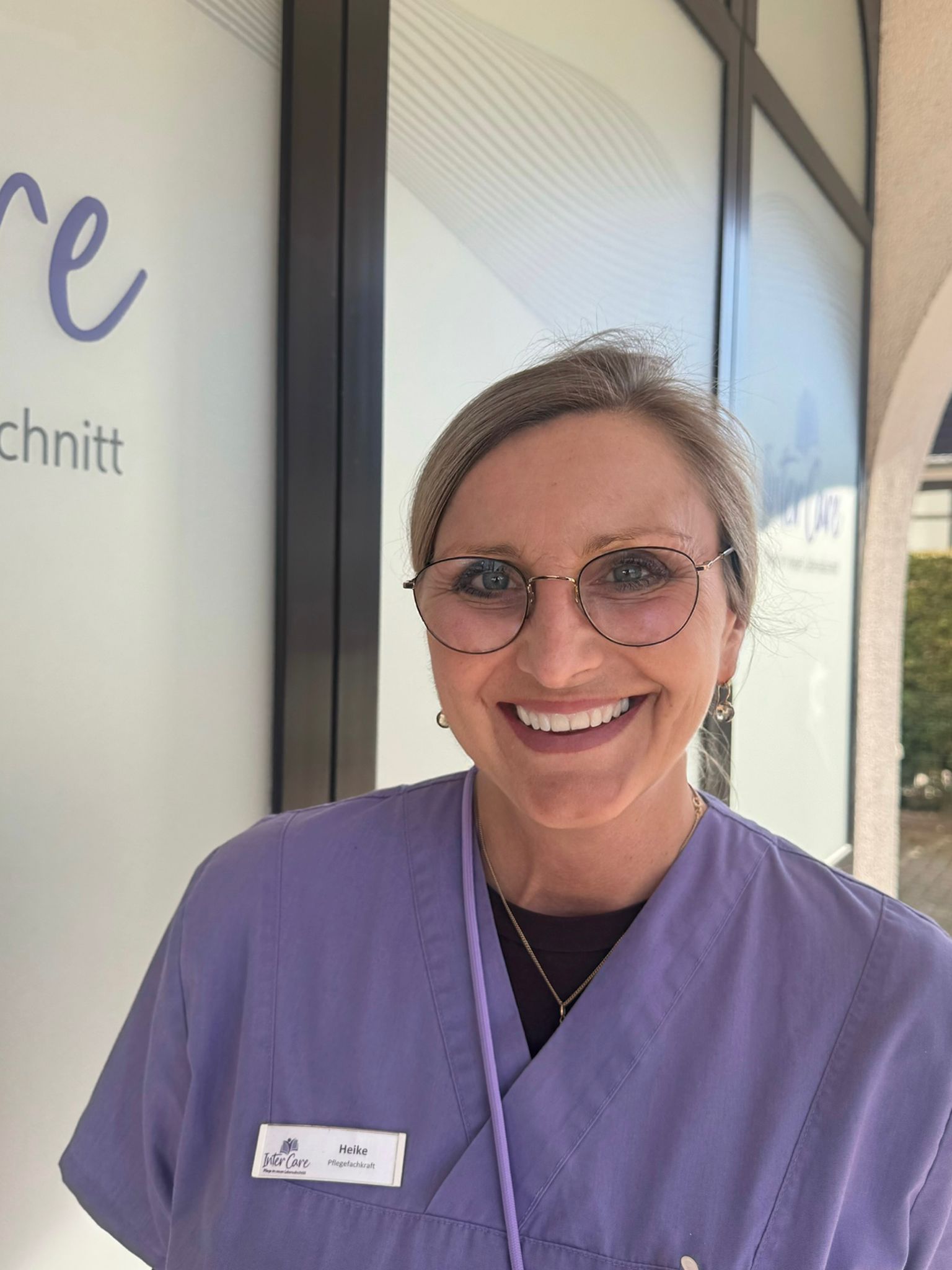 Person steht vor einem Fenster mit dem Schriftzug 'Inter Care'.